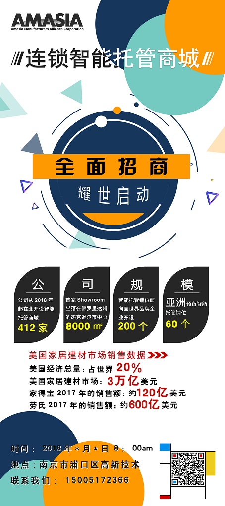 AMASIA家居建材連鎖智能托管商城,近期正在緊鑼密鼓的籌建招商中,面向全球品牌企業(yè)開設(shè)200個智能托管鋪位。為配合中國“一帶一路”戰(zhàn)略構(gòu)想,順應(yīng)國際經(jīng)貿(mào)合作與經(jīng)貿(mào)機(jī)制轉(zhuǎn)型的需要,其中有60個鋪位面向亞洲國家和地區(qū)。