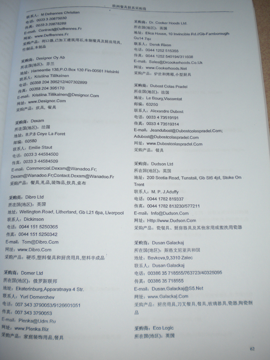 資料如何收集:在各大展會(huì)上,我們免費(fèi)向到會(huì)采購商提供他們需要的最新產(chǎn)品雜志和光盤,我們也同時(shí)向他們派發(fā)帶有我們網(wǎng)站LOGO的精美禮品,這些最新的中國供應(yīng)商的信息,對他們很有幫助,采購商會(huì)留下他們的名片,填寫詳細(xì)的產(chǎn)品求購信息,以期望得到更多的供應(yīng)商的信息。收集到這些第一手的原始外商資料后,我們客戶服務(wù)中心立刻將名片掃描作成圖片,將產(chǎn)品采購信息做成數(shù)據(jù)庫,將采購商資料按行業(yè)不同,匯編成冊,出版發(fā)行《全球采購商黃頁》系列。