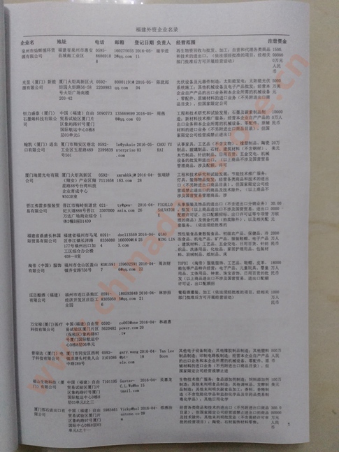 最新福建外資企業(yè)黃頁涵蓋了福建外商獨(dú)資企業(yè)、中外合資經(jīng)營(yíng)企業(yè)以及港、澳、臺(tái)資企業(yè),包括福建日資臺(tái)資企業(yè)黃頁,福建外企黃頁具體內(nèi)容包括:企業(yè)名稱、地址、電話、傳真、郵箱、經(jīng)營(yíng)范圍、注冊(cè)資金等信息;福建外資企業(yè)名單里面的企業(yè)都一些中外合資的大企業(yè),這些公司經(jīng)濟(jì)實(shí)力都比較雄厚,出口產(chǎn)品也比較多,業(yè)務(wù)范圍都比較廣,跟他們開展業(yè)務(wù)往來都比較容易;有了福建日企臺(tái)企黃頁開展業(yè)務(wù)也有了針對(duì)性,也省去了盲目去尋找客戶名單而浪費(fèi)的時(shí)間了,工作效率也會(huì)有很大的提高.歡迎需要的客戶及時(shí)聯(lián)系我們!