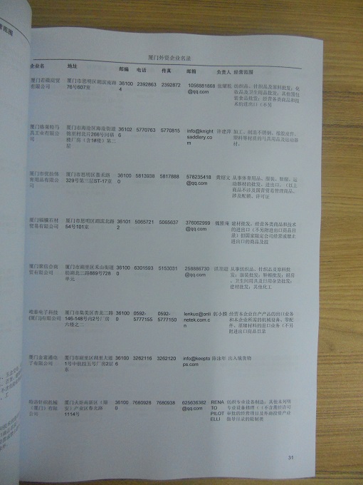 最新廈門(mén)外資企業(yè)黃頁(yè)涵蓋了廈門(mén)外商獨(dú)資企業(yè)、中外合資經(jīng)營(yíng)企業(yè)以及港、澳、臺(tái)資企業(yè),包括廈門(mén)臺(tái)資日資企業(yè)黃頁(yè),廈門(mén)外企黃頁(yè)具體內(nèi)容包括:企業(yè)名稱(chēng)、地址、電話、傳真、郵箱、經(jīng)營(yíng)范圍、注冊(cè)資金等信息;廈門(mén)外資企業(yè)名單里面的企業(yè)都一些中外合資的大企業(yè),這些公司經(jīng)濟(jì)實(shí)力都比較雄厚,出口產(chǎn)品也比較多,業(yè)務(wù)范圍都比較廣,跟他們開(kāi)展業(yè)務(wù)往來(lái)都比較容易;有了廈門(mén)臺(tái)企日企黃頁(yè)開(kāi)展業(yè)務(wù)也有了針對(duì)性,也省去了盲目去尋找客戶名單而浪費(fèi)的時(shí)間了,工作效率也會(huì)有很大的提高.歡迎需要的客戶及時(shí)聯(lián)系我們!