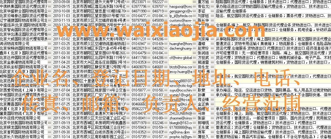 北京貨運(yùn)代理公司名單數(shù)據(jù)為Excel格式,信息可任意修改、復(fù)制、打印、導(dǎo)出及導(dǎo)入到傳真、郵件群發(fā)等軟件中,無(wú)任何限制。