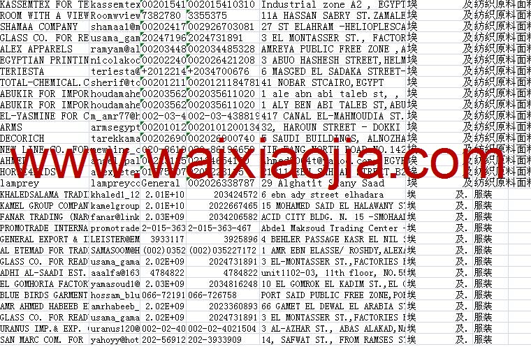埃及采購商名單數(shù)據(jù)為Excel格式,信息可任意修改、復(fù)制、打印、導(dǎo)出及導(dǎo)入到傳真、郵件群發(fā)等軟件中,無任何限制。