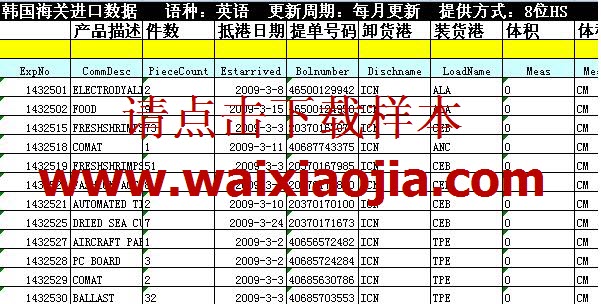 韓國海關(guān)進出口數(shù)據(jù)(KRCD)共有10個字段(10列,EXCEL格式),含韓國進口商(出口商)當(dāng)月產(chǎn)品進口(出口)貿(mào)易額排序,及其聯(lián)系方式等