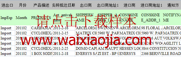 北美進(jìn)出口統(tǒng)計(jì)數(shù)據(jù)共32個(gè)字段(32列,EXCEL格式),含進(jìn)出口、10位海關(guān)編碼、產(chǎn)品描述、月份、數(shù)量、金額、關(guān)別、國別等信息。