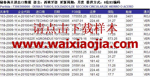 秘魯進口關(guān)單數(shù)據(jù),以秘魯本土企業(yè)向全球 200 多個國家和地區(qū)進口各類商品的進口申報單證為依據(jù)。按照具體產(chǎn)品的精確 HS 編碼提供。數(shù)據(jù)內(nèi)容包括: 海關(guān)單號、企業(yè)代碼、進口商、日期、 FOB 值、 運費、保險、艙儲、通關(guān)類型、凈重、件數(shù) 、序號、海關(guān)編碼、產(chǎn)品描述、數(shù)量、單位、采購國、原產(chǎn)國、凈重、 FOB 價、 運費、保險、證書、從價、銷售稅等項次內(nèi)容。