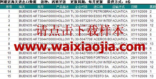 阿根廷進(jìn)口關(guān)單數(shù)據(jù),以 阿根廷 本土企業(yè)向全球 200 多個(gè)國(guó)家和地區(qū)進(jìn)口各類商品的進(jìn)口申報(bào)單證為依據(jù)。按照具體產(chǎn)品的精確 HS 編碼提供。數(shù)據(jù)內(nèi)容包括:海關(guān)單標(biāo)識(shí)符、通關(guān)日期、數(shù)據(jù)類型、海關(guān)編碼、進(jìn)口商名稱、進(jìn)口商地址、電話、進(jìn)口關(guān)別、運(yùn)輸方式、原產(chǎn)國(guó)、貿(mào)易國(guó)、 FOB 美元單價(jià)、 FOB 美元總價(jià)、 運(yùn)費(fèi)、保險(xiǎn)、 CIF 美元總價(jià)、 數(shù)量、數(shù)量單位、凈重千克、運(yùn)輸標(biāo)志、附加數(shù)量、 FOB 單價(jià)、 FOB 總價(jià)、 貨幣單位、詳細(xì)產(chǎn)品描述、海關(guān)編碼詳細(xì)描述等情報(bào)內(nèi)容。