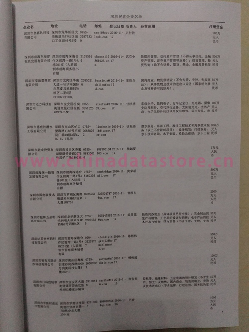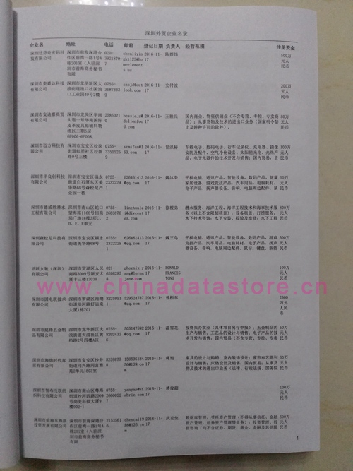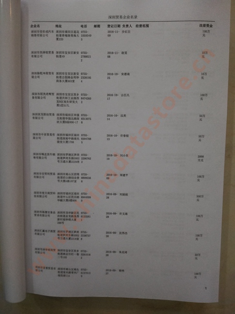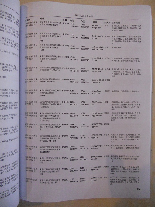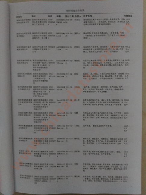 2021版最新深圳企業(yè)黃頁(yè)包括《深圳制造企業(yè)黃頁(yè)》、《深圳貿(mào)易企業(yè)黃頁(yè)》、《深圳民營(yíng)企業(yè)黃頁(yè)》、《深圳外資企業(yè)黃頁(yè)》、《深圳外貿(mào)企業(yè)黃頁(yè)》共五冊(cè),現(xiàn)優(yōu)惠價(jià):280元/冊(cè)。每?jī)?cè)內(nèi)容包括:?jiǎn)挝幻Q、地址、郵編、電話、傳真、郵箱、經(jīng)營(yíng)范圍等;深圳企業(yè)黃頁(yè)涵蓋了近幾年來(lái)最新成立的、有一定規(guī)模的企業(yè),具有非常高的營(yíng)銷(xiāo)價(jià)值。有了這套黃頁(yè)開(kāi)展業(yè)務(wù)也有了針對(duì)性,也省去了盲目去尋找客戶名單而浪費(fèi)的時(shí)間了,工作效率也會(huì)有很大的提高。歡迎需要深圳企業(yè)黃頁(yè)的朋友及時(shí)聯(lián)系我們!
