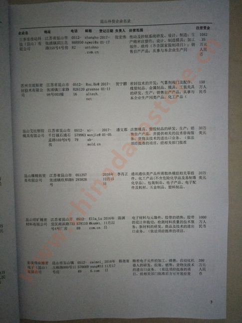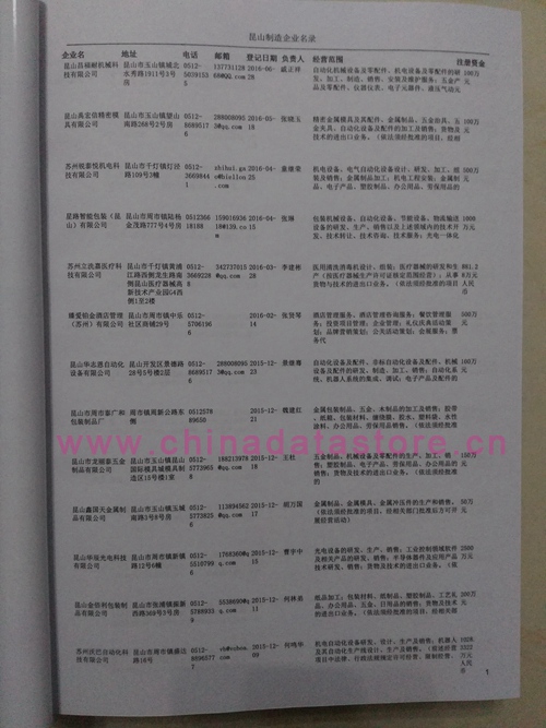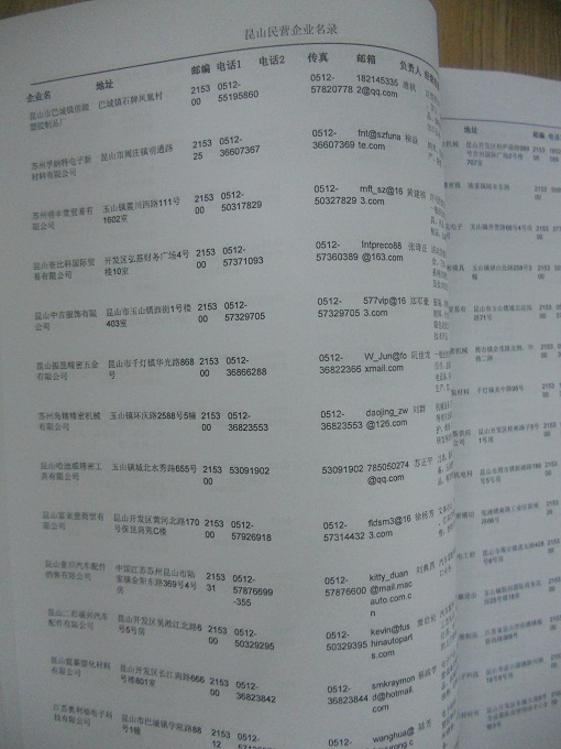 2021版最新昆山企業(yè)黃頁(yè)包括《昆山制造企業(yè)黃頁(yè)》、《昆山貿(mào)易企業(yè)黃頁(yè)》、《昆山民營(yíng)企業(yè)黃頁(yè)》、《昆山外資企業(yè)黃頁(yè)》、《昆山外貿(mào)企業(yè)黃頁(yè)》共五冊(cè),現(xiàn)優(yōu)惠價(jià):280元/冊(cè)。每?jī)?cè)內(nèi)容包括:?jiǎn)挝幻Q、地址、郵編、電話、傳真、郵箱、經(jīng)營(yíng)范圍等;昆山企業(yè)黃頁(yè)涵蓋了近幾年來(lái)最新成立的、有一定規(guī)模的企業(yè),具有非常高的營(yíng)銷價(jià)值。有了這套黃頁(yè)開(kāi)展業(yè)務(wù)也有了針對(duì)性,也省去了盲目去尋找客戶名單而浪費(fèi)的時(shí)間了,工作效率也會(huì)有很大的提高。歡迎需要昆山企業(yè)黃頁(yè)的朋友及時(shí)聯(lián)系我們!