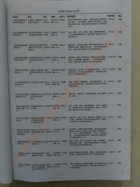 2024年新版中國建材采購企業(yè)黃頁,收錄了全國各地經(jīng)營范圍涉及建材產(chǎn)品的貿(mào)易企業(yè),這些都是頗具實(shí)力的建材產(chǎn)品的中國采購商。黃頁內(nèi)容包含:企業(yè)名稱、地址、電話、傳真、郵箱、經(jīng)營范圍、省份、注冊資金等信息。該套黃頁包含一個黃頁光碟加一冊紙質(zhì)書刊,全國價格:1500元,省/直轄市價格:400元,城市價格:200元,共收錄了全國各地大概111371(統(tǒng)計日期:2018.1)家建材產(chǎn)品采購企業(yè)。黃頁光碟中是EXCEL格式,信息可任意修改、復(fù)制、打印、導(dǎo)出及導(dǎo)入到傳真、郵件群發(fā)等軟件中,無任何限制。