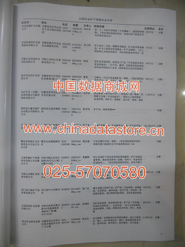 2024年新版中國(guó)冶金礦產(chǎn)采購(gòu)企業(yè)黃頁(yè),收錄了全國(guó)各地經(jīng)營(yíng)范圍涉及冶金礦產(chǎn)產(chǎn)品的貿(mào)易企業(yè),這些都是頗具實(shí)力的冶金礦產(chǎn)產(chǎn)品的中國(guó)采購(gòu)商。黃頁(yè)內(nèi)容包含:企業(yè)名稱、地址、電話、傳真、郵箱、經(jīng)營(yíng)范圍、省份、注冊(cè)資金等信息。該套黃頁(yè)包含一個(gè)黃頁(yè)光碟加一冊(cè)紙質(zhì)書刊,全國(guó)價(jià)格:1500元,省/直轄市價(jià)格:400元,城市價(jià)格:200元,共收錄了全國(guó)各地大概8042(統(tǒng)計(jì)日期:2018.1)家冶金礦產(chǎn)產(chǎn)品采購(gòu)企業(yè)。黃頁(yè)光碟中是EXCEL格式,信息可任意修改、復(fù)制、打印、導(dǎo)出及導(dǎo)入到傳真、郵件群發(fā)等軟件中,無(wú)任何限制。