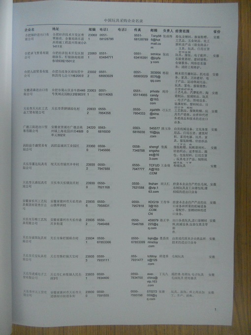 2024年新版中國(guó)玩具采購(gòu)企業(yè)黃頁(yè),收錄了全國(guó)各地經(jīng)營(yíng)范圍涉及玩具產(chǎn)品的貿(mào)易企業(yè),這些都是頗具實(shí)力的玩具產(chǎn)品的中國(guó)采購(gòu)商。黃頁(yè)內(nèi)容包含:企業(yè)名稱、地址、電話、傳真、郵箱、經(jīng)營(yíng)范圍、省份、注冊(cè)資金等信息。該套黃頁(yè)包含一個(gè)黃頁(yè)光碟加一冊(cè)紙質(zhì)書(shū)刊,全國(guó)價(jià)格:1500元,省/直轄市價(jià)格:400元,城市價(jià)格:200元,共收錄了全國(guó)各地大概1852(統(tǒng)計(jì)日期:2018.1)家玩具產(chǎn)品采購(gòu)企業(yè)。黃頁(yè)光碟中是EXCEL格式,信息可任意修改、復(fù)制、打印、導(dǎo)出及導(dǎo)入到傳真、郵件群發(fā)等軟件中,無(wú)任何限制。