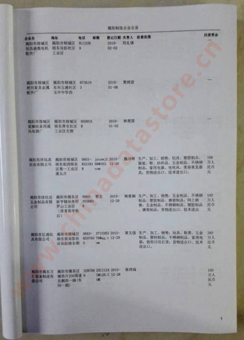 2021版最新揭陽企業(yè)黃頁包括《揭陽制造企業(yè)黃頁》、《揭陽民營企業(yè)黃頁》,現(xiàn)優(yōu)惠價:280元/冊。每冊內(nèi)容包括:單位名稱、地址、郵編、電話、傳真、郵箱、經(jīng)營范圍等;揭陽企業(yè)黃頁涵蓋了近幾年來最新成立的、有一定規(guī)模的企業(yè),具有非常高的營銷價值。有了這套黃頁開展業(yè)務(wù)也有了針對性,也省去了盲目去尋找客戶名單而浪費的時間了,工作效率也會有很大的提高。歡迎需要揭陽企業(yè)黃頁的朋友及時聯(lián)系我們!