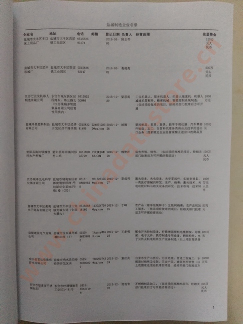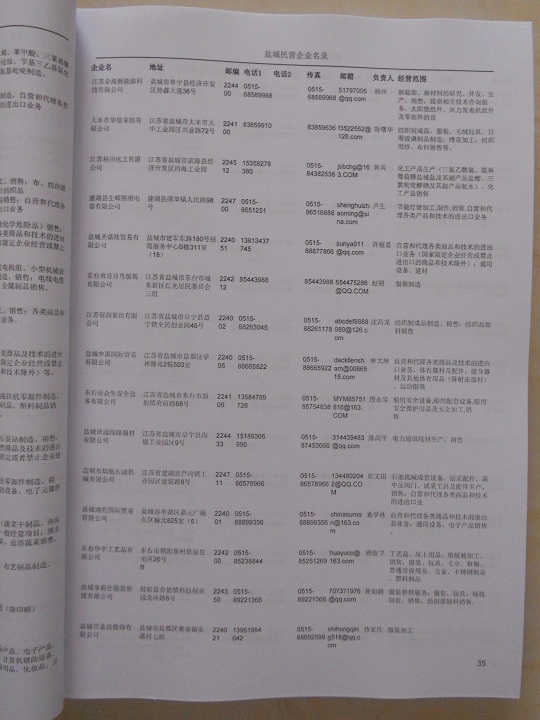 2021版最新鹽城企業(yè)黃頁包括《鹽城制造企業(yè)黃頁》、《鹽城民營企業(yè)黃頁》,現(xiàn)優(yōu)惠價:280元/冊。每冊內(nèi)容包括:單位名稱、地址、郵編、電話、傳真、郵箱、經(jīng)營范圍等;鹽城企業(yè)黃頁涵蓋了近幾年來最新成立的、有一定規(guī)模的企業(yè),具有非常高的營銷價值。有了這套黃頁開展業(yè)務(wù)也有了針對性,也省去了盲目去尋找客戶名單而浪費的時間了,工作效率也會有很大的提高。歡迎需要鹽城企業(yè)黃頁的朋友及時聯(lián)系我們!