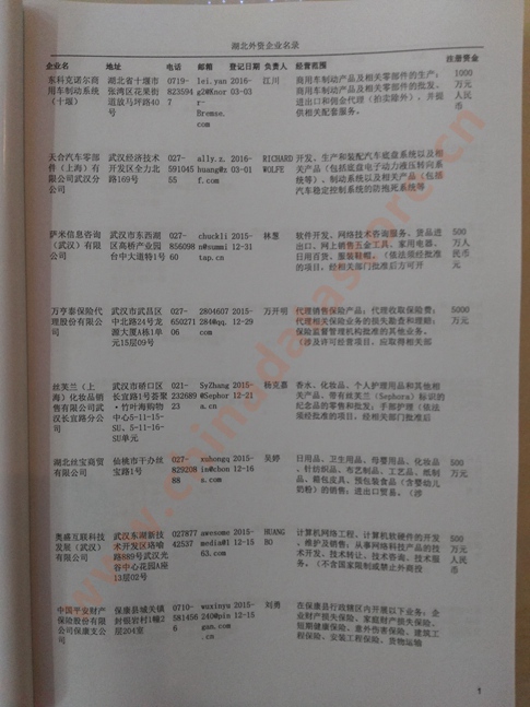 最新湖北外資企業(yè)黃頁(yè)涵蓋了湖北外商獨(dú)資企業(yè)、中外合資經(jīng)營(yíng)企業(yè)以及港、澳、臺(tái)資企業(yè),包括湖北臺(tái)資日資企業(yè)黃頁(yè),湖北外企黃頁(yè)具體內(nèi)容包括:企業(yè)名稱、地址、電話、傳真、郵箱、經(jīng)營(yíng)范圍、注冊(cè)資金等信息;湖北外資企業(yè)名單里面的企業(yè)都一些中外合資的大企業(yè),這些公司經(jīng)濟(jì)實(shí)力都比較雄厚,出口產(chǎn)品也比較多,業(yè)務(wù)范圍都比較廣,跟他們開(kāi)展業(yè)務(wù)往來(lái)都比較容易;有了湖北臺(tái)企日企黃頁(yè)開(kāi)展業(yè)務(wù)也有了針對(duì)性,也省去了盲目去尋找客戶名單而浪費(fèi)的時(shí)間了,工作效率也會(huì)有很大的提高.歡迎需要的客戶及時(shí)聯(lián)系我們!