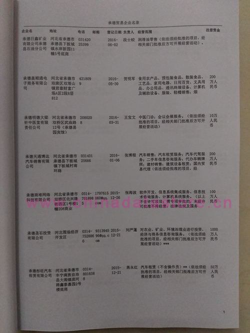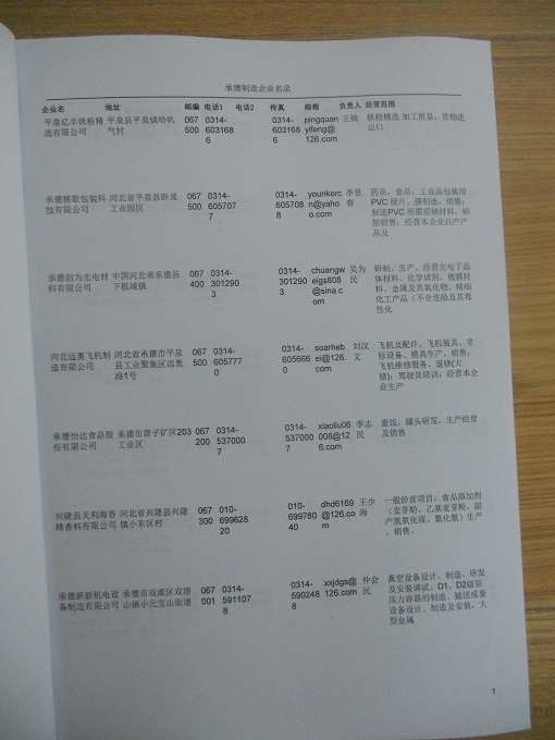 2021版最新承德企業(yè)黃頁(yè)包括《承德制造企業(yè)黃頁(yè)》、《承德民營(yíng)企業(yè)黃頁(yè)》,現(xiàn)優(yōu)惠價(jià):280元/冊(cè)。每?jī)?cè)內(nèi)容包括:?jiǎn)挝幻Q(chēng)、地址、郵編、電話、傳真、郵箱、經(jīng)營(yíng)范圍等;承德企業(yè)黃頁(yè)涵蓋了近幾年來(lái)最新成立的、有一定規(guī)模的企業(yè),具有非常高的營(yíng)銷(xiāo)價(jià)值。有了這套黃頁(yè)開(kāi)展業(yè)務(wù)也有了針對(duì)性,也省去了盲目去尋找客戶(hù)名單而浪費(fèi)的時(shí)間了,工作效率也會(huì)有很大的提高。歡迎需要承德企業(yè)黃頁(yè)的朋友及時(shí)聯(lián)系我們!