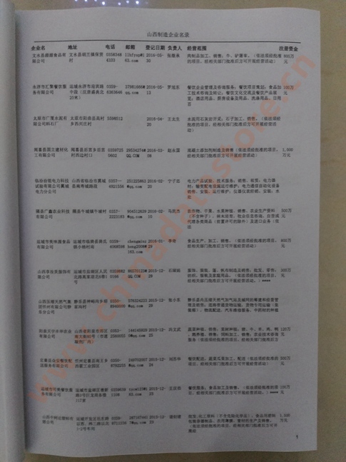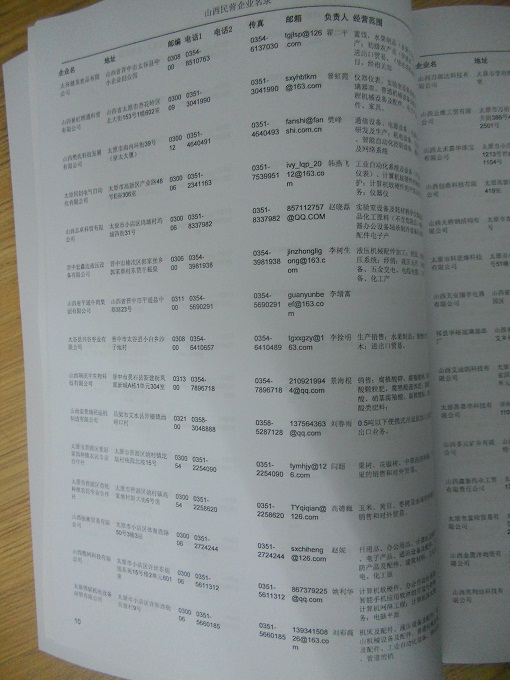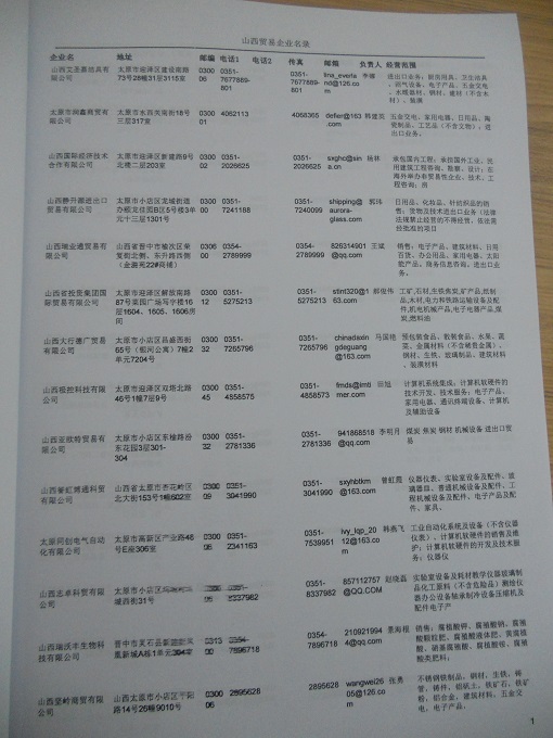 2021版最新山西企業(yè)黃頁包括《山西制造企業(yè)黃頁》、《山西貿(mào)易企業(yè)黃頁》、《山西民營企業(yè)黃頁》共三冊,優(yōu)惠價:280元/冊。每冊內(nèi)容包括:單位名稱、地址、郵編、電話、傳真、郵箱、經(jīng)營范圍等;山西企業(yè)黃頁涵蓋了近幾年來最新成立的、有一定規(guī)模的企業(yè),具有非常高的營銷價值。有了這套黃頁開展業(yè)務也有了針對性,也省去了盲目去尋找客戶名單而浪費的時間了,工作效率也會有很大的提高。歡迎需要山西企業(yè)黃頁的朋友及時聯(lián)系我們!