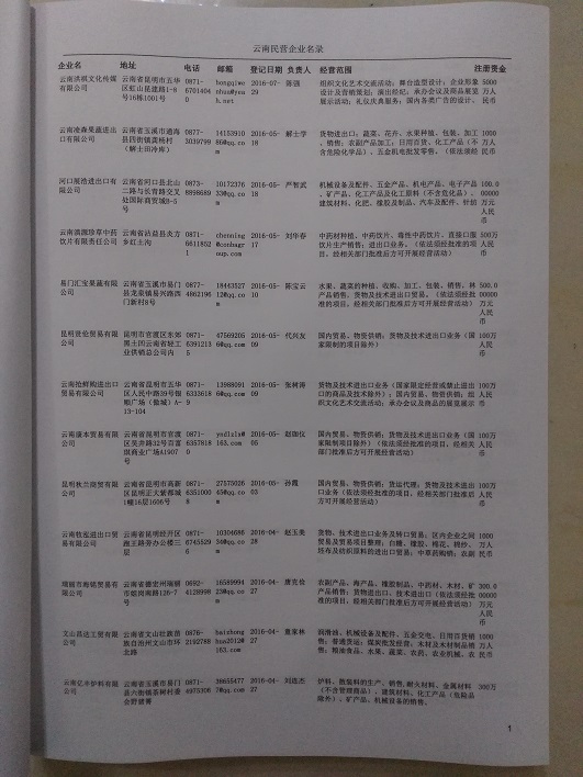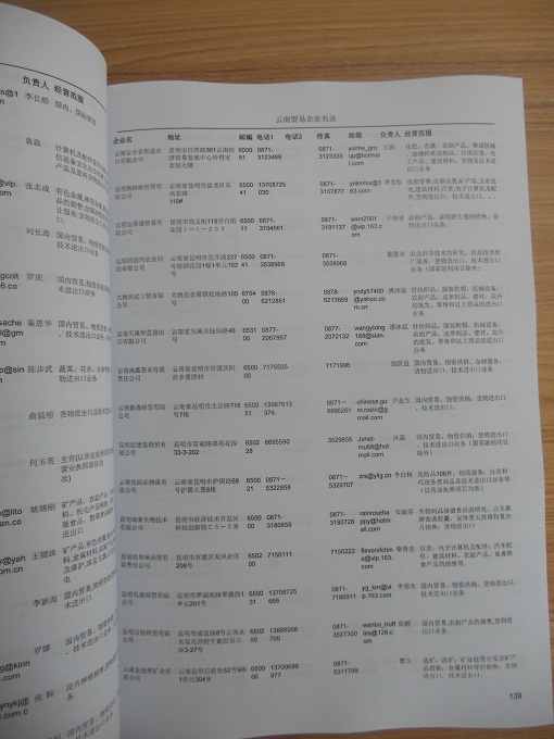 2021版最新云南企業(yè)黃頁包括《云南制造企業(yè)黃頁》、《云南貿(mào)易企業(yè)黃頁》、《云南民營企業(yè)黃頁》共三冊,優(yōu)惠價:280元/冊。每冊內(nèi)容包括:單位名稱、地址、郵編、電話、傳真、郵箱、經(jīng)營范圍等;云南企業(yè)黃頁涵蓋了近幾年來最新成立的、有一定規(guī)模的企業(yè),具有非常高的營銷價值。有了這套黃頁開展業(yè)務也有了針對性,也省去了盲目去尋找客戶名單而浪費的時間了,工作效率也會有很大的提高。歡迎需要云南企業(yè)黃頁的朋友及時聯(lián)系我們!
