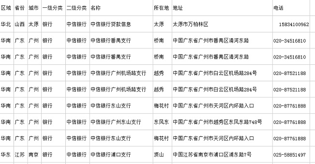 數(shù)據(jù)介紹:包含字段:包含字段:區(qū)域、省份、城市、一級分類、二級分類、名稱、所在地、地址、電話