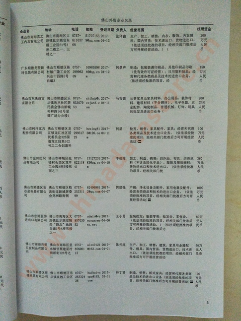 佛山外貿(mào)企業(yè)黃頁包括:外貿(mào)企業(yè)名稱、地址、電話、傳真、郵箱、經(jīng)營范圍、注冊資金等信息。