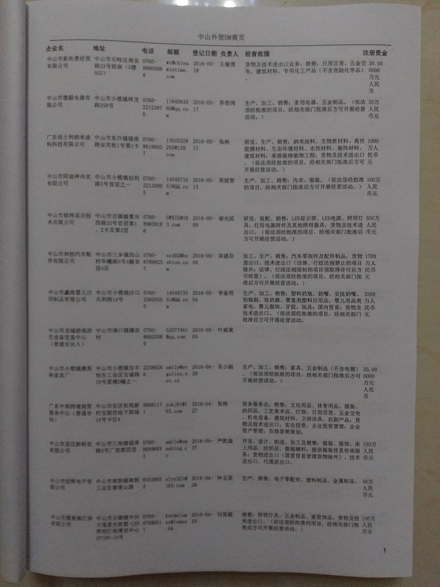 中山外貿(mào)企業(yè)黃頁包括:外貿(mào)企業(yè)名稱、地址、電話、傳真、郵箱、經(jīng)營范圍、注冊資金等信息。