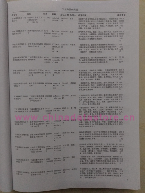 寧波外貿(mào)企業(yè)黃頁(yè)包括:外貿(mào)企業(yè)名稱、地址、電話、傳真、郵箱、經(jīng)營(yíng)范圍、注冊(cè)資金等信息。