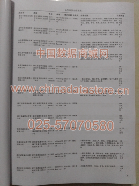 金華外貿(mào)企業(yè)黃頁(yè)包括:外貿(mào)企業(yè)名稱、地址、電話、傳真、郵箱、經(jīng)營(yíng)范圍、注冊(cè)資金等信息。