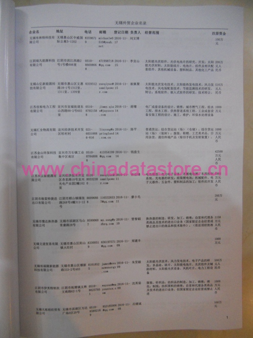 無錫外貿企業(yè)黃頁包括:外貿企業(yè)名稱、地址、電話、傳真、郵箱、經營范圍、注冊資金等信息。