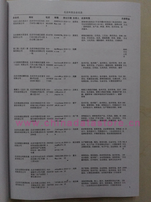 北京外貿(mào)企業(yè)黃頁包括:外貿(mào)企業(yè)名稱、地址、電話、傳真、郵箱、經(jīng)營范圍、注冊資金等信息。