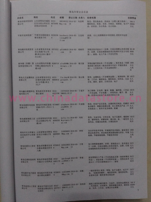 青島外貿(mào)企業(yè)黃頁包括:外貿(mào)企業(yè)名稱、地址、電話、傳真、郵箱、經(jīng)營(yíng)范圍、注冊(cè)資金等信息。