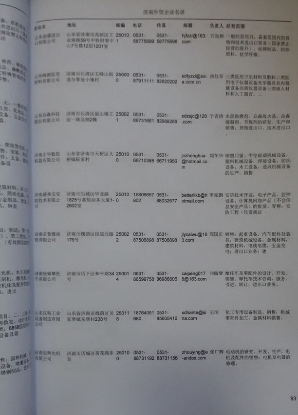 濟(jì)南外貿(mào)企業(yè)黃頁包括:外貿(mào)企業(yè)名稱、地址、電話、傳真、郵箱、經(jīng)營范圍、注冊資金等信息。