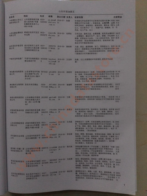 山東外貿(mào)企業(yè)黃頁包括:外貿(mào)企業(yè)名稱、地址、電話、傳真、郵箱、經(jīng)營(yíng)范圍、注冊(cè)資金等信息。