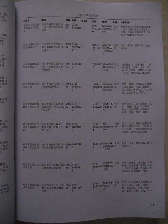 汕頭外貿(mào)企業(yè)黃頁包括:外貿(mào)企業(yè)名稱、地址、電話、傳真、郵箱、經(jīng)營范圍、注冊資金等信息。