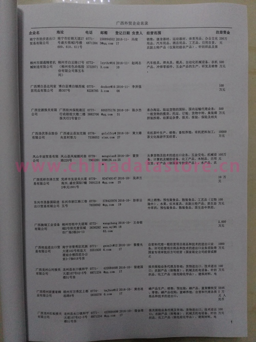 廣西外貿(mào)企業(yè)黃頁包括:外貿(mào)企業(yè)名稱、地址、電話、傳真、郵箱、經(jīng)營(yíng)范圍、注冊(cè)資金等信息。