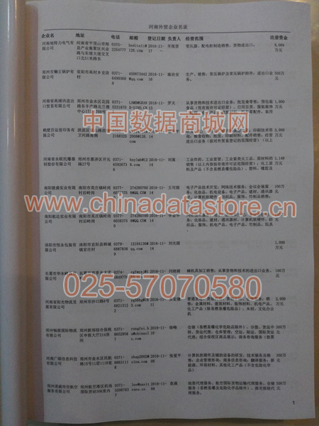 河南外貿(mào)企業(yè)黃頁包括:外貿(mào)企業(yè)名稱、地址、電話、傳真、郵箱、經(jīng)營范圍、注冊資金等信息。