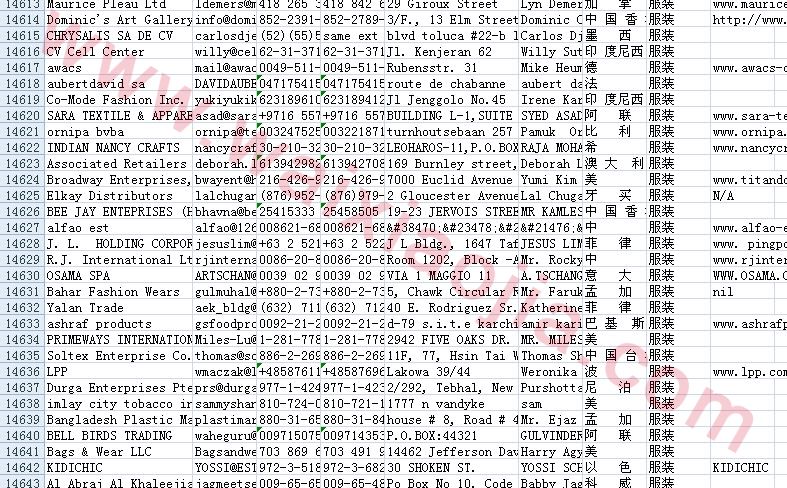 服裝、服飾采購商名單數(shù)據(jù)為Excel格式,信息可任意修改、復(fù)制、打印、導(dǎo)出及導(dǎo)入到傳真、郵件群發(fā)等軟件中,無任何限制。